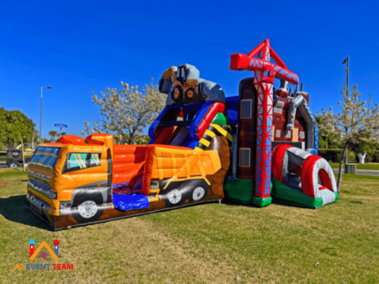 This Construction Bounce House with an Inflatable Slide and Basketball hoop will get your little dirt lovers moving! Kids love to jump and bounce, and it is even better when they feel like they are climbing right in the big equipment! This inflatable bounce house has a large bounce area, an inflatable double lane slide, and a basketball hoop. This inflatable rental is a showstopper for birthday parties to large-scale events.