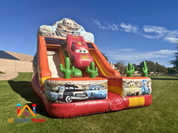 Race to the Finish with the 22ft Cars Double Lane Inflatable Slide! The Cars Double Lane Slide from AZ Event Team is the ultimate attraction for racing fans and event planners alike. Standing a massive 22ft tall, this high-performance inflatable brings the magic of Radiator Springs directly to your Arizona event. This isn't just a slide; it’s an experience. Featuring a massive 3D Lightning McQueen that kids actually climb under to reach the stairs, this slide is a visual powerhouse. The high-definition digital graphics feature all the favorite characters from the Disney Pixar Cars Movie, making it a guaranteed "wow" factor for your guest's photos.