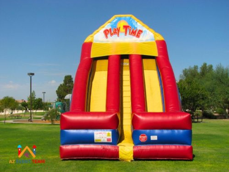 The Double Lane Mega Slide is 24 feet tall.  This slide rental is perfect for school festivals, church carnivals, company parties, or any event you can think of!  With two lanes this inflatable slide is sure to impress and keep the lines moving. Great for all ages even mom and dad will have fun.  The inflatable features a front entrance and side exits to help with congestion.  This is a dry-only slide.