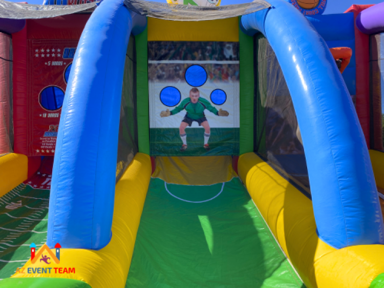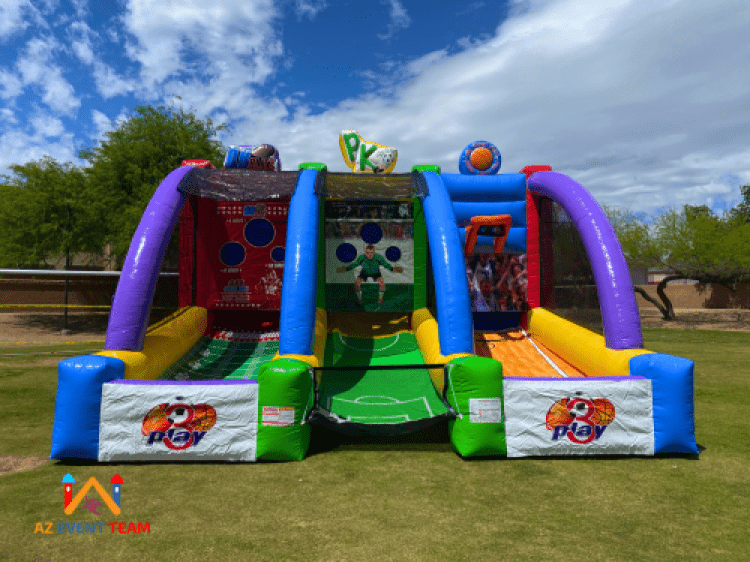 The 3 Game Play is an inflatable game with three different sports options, so you are getting one unit with 3 sports! All games face the same direction to make supervising the game a breeze. This inflatable rental includes basketball, football, and soccer ball. The 3 Game Play includes all the balls and accessories needed to play the games. This inflatable item is perfect for large events at schools, churches or festivals!