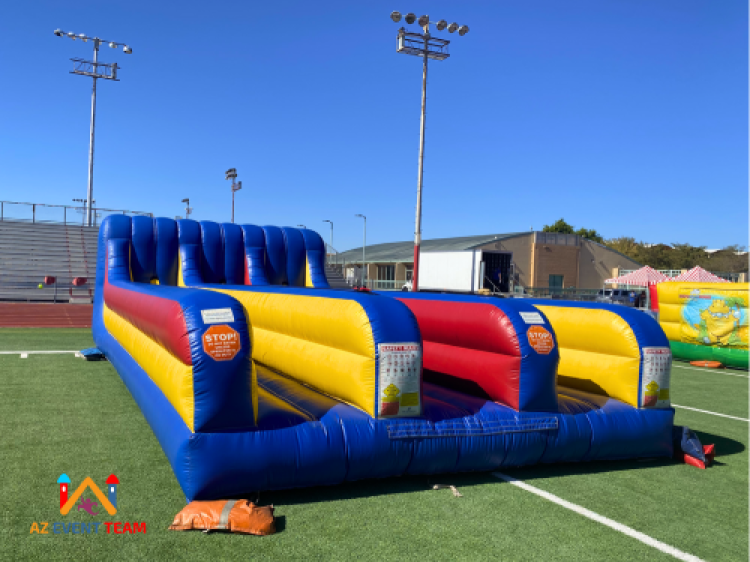 Race to see who can run the farthest while stretching the giant bungee cords! This interactive 3 Lane Inflatable Bungee Run rental is super fun and will surely be a favorite at your next event. Inflatable Bungee Run games are considered a classic piece that is still popular with kids and adults. Each player enters their lane and puts a harness on. When all players are ready the game supervisor starts the game. The player that pulls the hardest and places their marker the furthest is the winner. Nothing like a little head to head competition to get your juices flowing. Inflatable bungee runs are great for any event including school carnivals, graduation parties, team building, and company parties.
