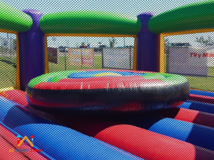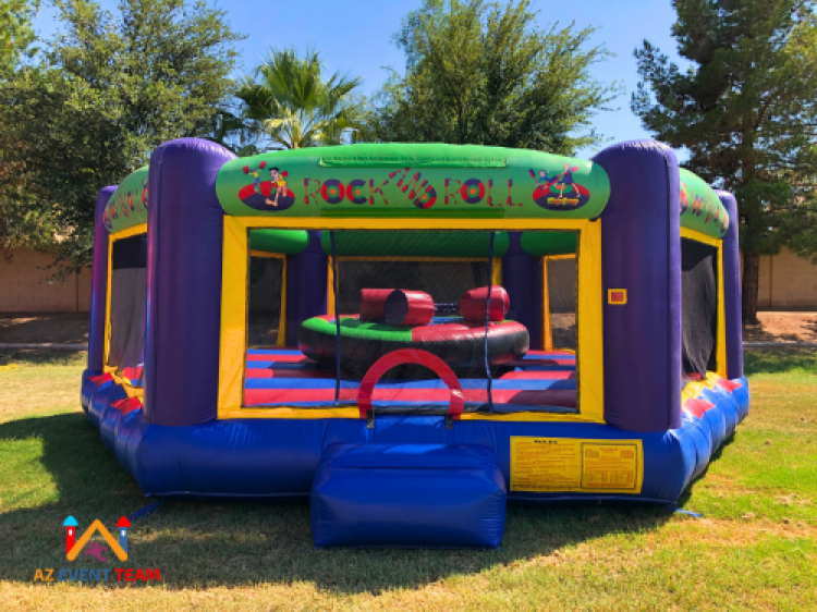 The Rock N Roll Joust is an inflatable jousting arena with one large pedestal in the middle. The inflatable arena includes two padded foam jousting poles and headgear. This is a two-person interactive game that starts with them standing on one inflatable pedestal. With their headgear on and joust poles in hand the two players battle to the win. A player wins a match when the other player falls off the inflated pedestal. Don't worry they land on a soft inflatable mattress, remember this is just for fun! The Rock N Roll inflatable joust arena is a great form of team building events to company parties.
