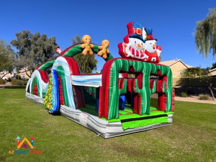 The Holiday Fun Obstacle Course provides tons of fun with a beautiful Christmas theme. With the size of this inflatable obstacle course it will fit in most backyards and indoors like auditoriums and gyms. The obstacle course starts with you climbing through the arch, climbing up the ball, small slide down, through obstacles and out the logs. Rest assured this will entertain all your guest from age three to teens to adults. This adorable holiday Christmas themed obstacle course is perfect for any event!