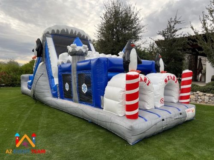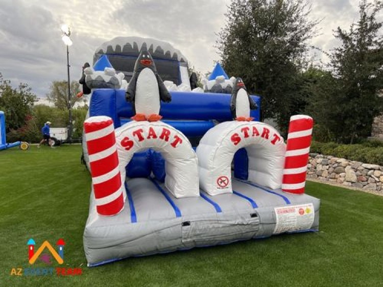 The Penguin Obstacle Course provides tons of fun. With the size of this inflatable obstacle course being only forty-two feet, it will fit in most backyards and indoors like auditoriums and gyms. The obstacle course starts with a tunnel for your guest to climb through, logs to finesse themselves between, popups, and you end with a large slide. Rest assured this will entertain all your guest from age three to teens. This adorable holiday themed obstacle course is perfect for any event!