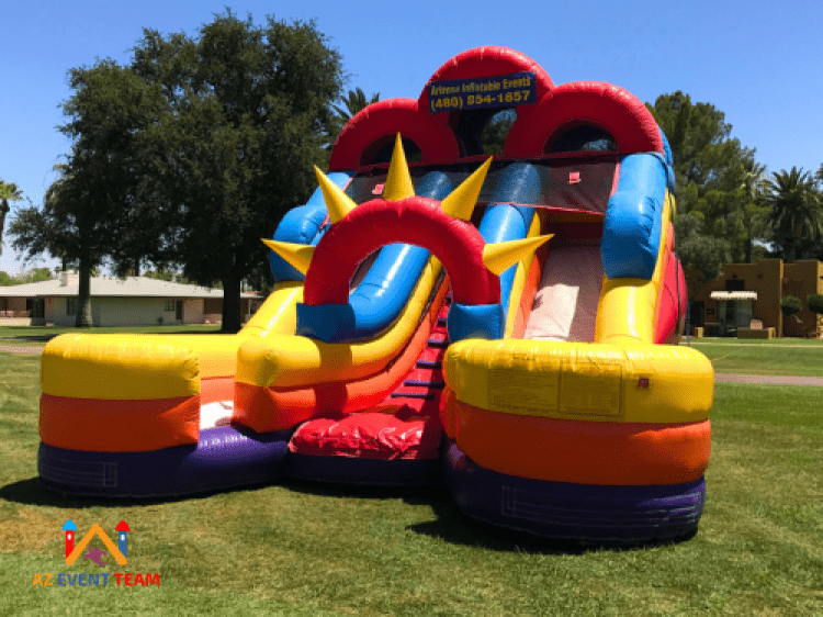 The Double Down Water Slide has two slide lanes allowing for double the fun.  Enter up the center of the inflatable slide rental where one goes right and one goes left to slide down!  Water Sprays from the top of each slide keeping the kids and the inflatable wet all day! This is a great slide if you are having a larger party for kids twelve and under.  Slide features easy climb stairs and a no jump netting.