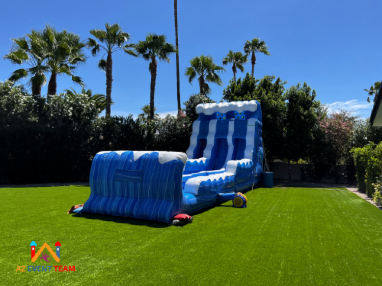 The Double Wave Water Slide Rental is 18' tall with a double lane Slip N Slide attached. The bright blue colors with the white wave accent will make you feel like you are surfing the waves in the middle of the desert. Two lanes allow for two people to slide at the same time. The best part of this slide is the inflatable Slip N Slide! Inflatable Slip N Slide rentals have become very popular. With this inflatable rental, you get the best of both worlds. You have a drop from the water slide and go straight into the slip n slide!