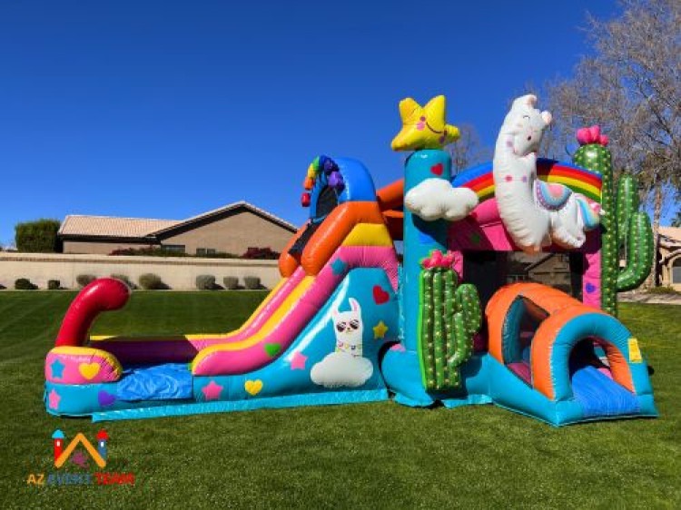 The Llama Bounce House Water Slide Combo is the perfect center piece of your event. This inflatable is brightly colored and loaded with a 3D Llama, cactus and rainbow popups. This item has a large and open bounce area as well as an inflatable basketball hoop in the corner. Kids will love to bounce and go down the water slide for hours! This event is prefect for any backyard birthday party or large scale event.